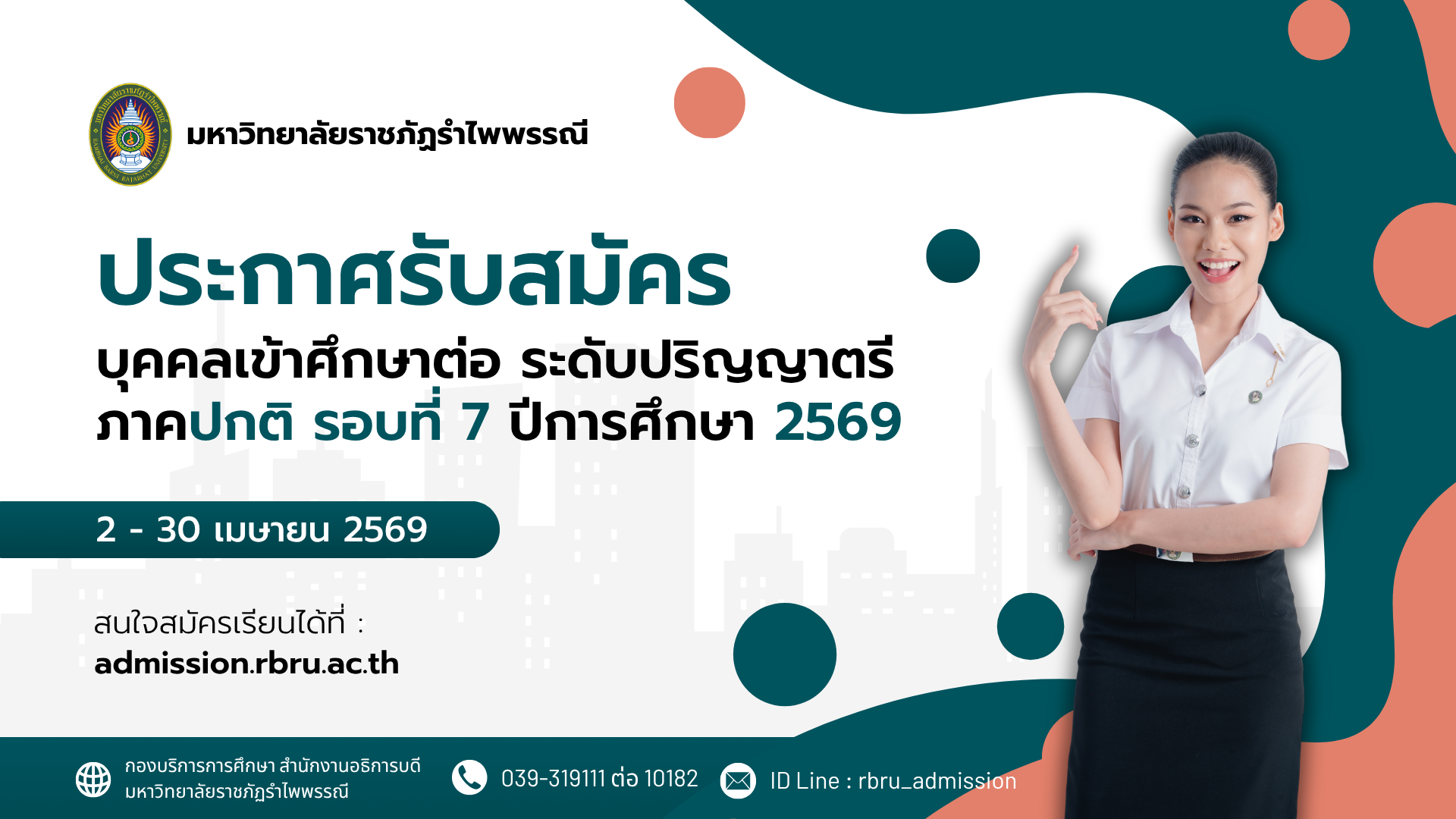 เปิดสมัครคัดเลือกบุคคลเข้าศึกษาระดับปริญญาตรี ภาคปกติ รอบที่ 7 ปีการศึกษา 2569 ระหว่างวันที่ 2 - 30 เมษายน 2569